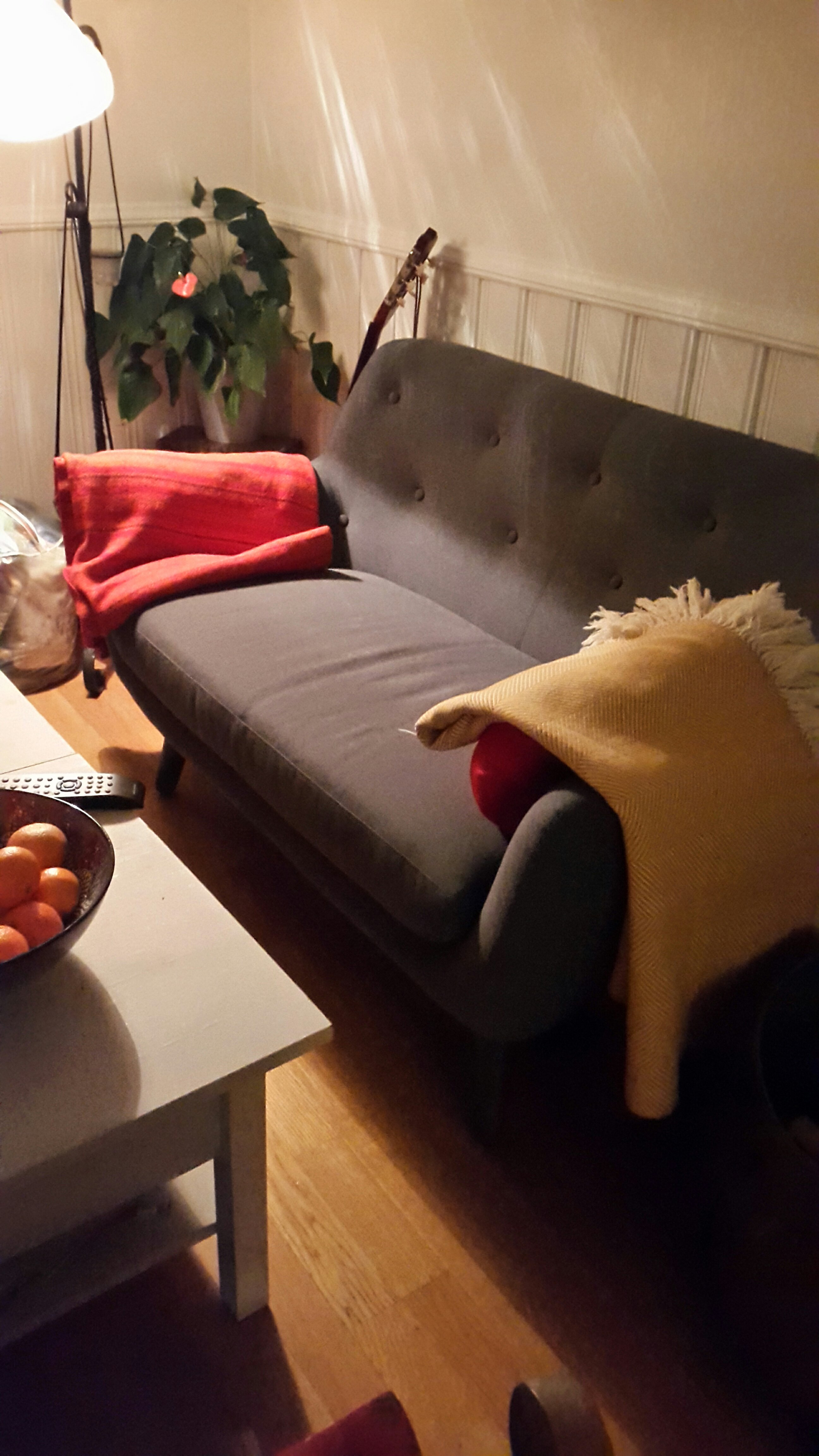 Ved å oppdage dette tankemønsteret og forstå det, iallefall til en viss grad, ble jeg litt skamfull. Jeg har jo innredet huset mitt etter dette prinsippet, stuen innbyr lite til avslapping, jeg forakter tanken på å ligge på sofaen å bare hvile. Sløsing av liv. Så sofaen vår er en liten toseter.