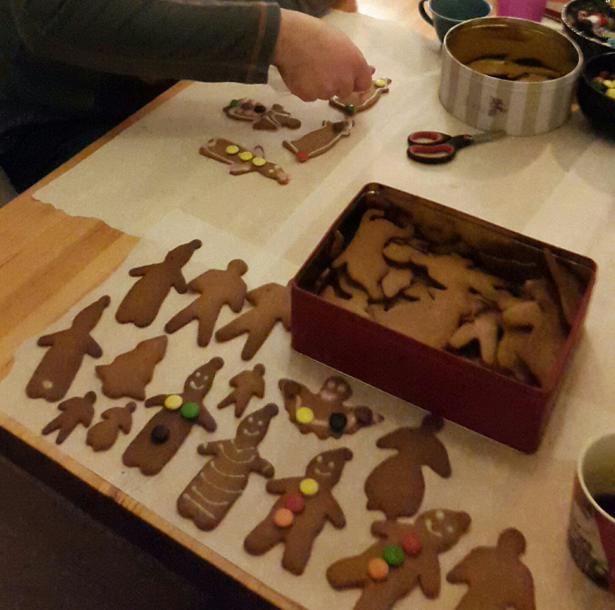 Lillebror kom på førjulsbesøk, leverte gaver til ungene mine, og ble på middag. Det var koselig. Vi ses ikke så ofte nå i travle voksenliv, med mange mil mellom oss. Desto hyggeligere når det klaffer😊 Han fikk også med seg pepperkakepyntingen, som naturlig nok er en populær syssel, i og med at smaking inngår, både kaker og nonstop.