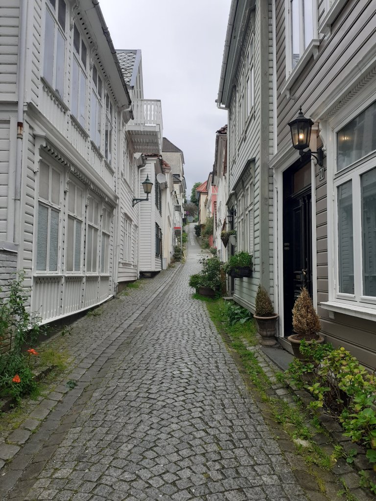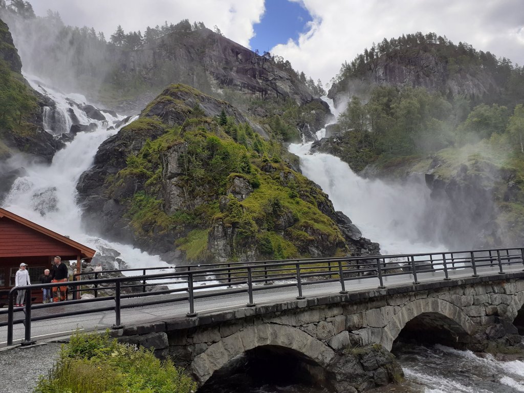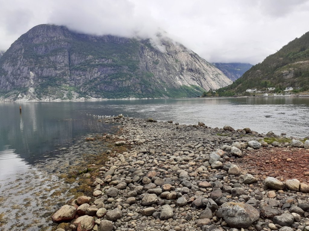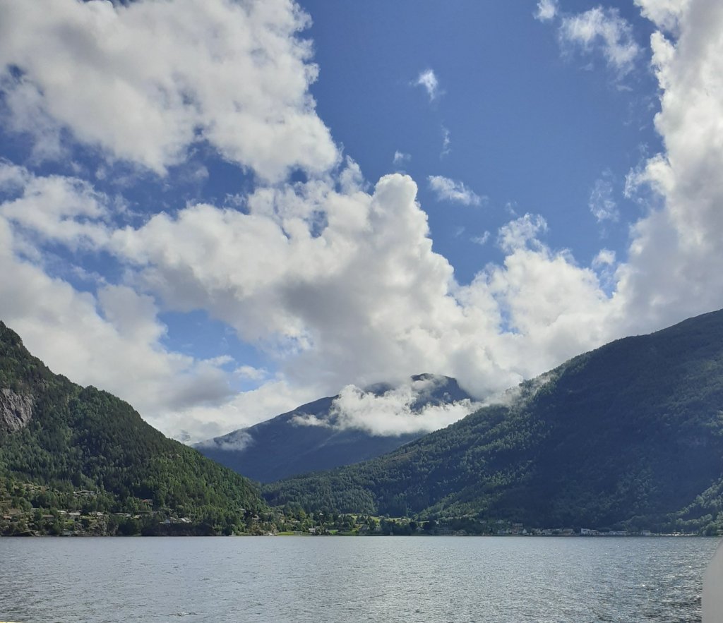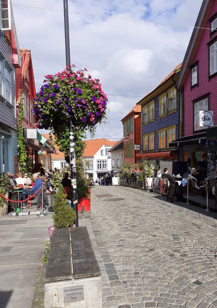 Vi så en del byer og tettsteder også, litt som en del av allmenndannelsen til avkommet, og oppfriskning for meg. Først stoppet vi i Hallingdal og sov to netter på hytta. Gikk en frisk fjelltur, hvor det faktisk sluddet litt, og nøt fjellvandringen på stier og over snø som fortsatt lå i enkelte områder. På kjøreturen til Bergen fikk vi sett Geilo, som hadde vokst mye siden sist jeg var forbi for kanskje 25 år siden. Stoppet i Eidfjord og spiste, gikk ned og så på utsikten over fjorden, den første av dem vi så. Bergen besøkte vi grundigere, sov en natt. Vi tok fløybanen og gikk rundt i byen, så gater, torg, smug, Bryggen, utstillinger. Kafeen det lille kaffekompagniet hadde god kaffe og kake! Regnet kom, og vi dro. Så Osøyro, som jeg gjerne skulle sett mer av, og vil anbefale andre å ta en titt på. Nordheimsund var et lite sted, som hadde noen fosser å by på, ellers var det ikke så mye vi bet oss merke i, den kvelden og natten vi var der. Vi fikk sett Jondalen, som jeg bare hadde et forhold til gjennom et stev, det var morsomt. I tillegg til at vi også fikk tatt ferge over Hardangerfjorden. Odda var et sted vi eller iallefall jeg hadde hørt om, som vi nå har sett, og selv om det lå fint til mellom fjellene kunne vi nok ikke bodd der. I Stavanger ble vi en natt, og fikk sett mye av sentrum gjennom timer med trasking på kryss og tvers. Vi fikk med oss et museumsbesøk som var interessant, lærte mye om byen, og fikk reflektert over samfunnsutviklingen som har skjedd de siste 100 år. Spiste lunsj på Hverdagsgodt, en koselig kafe som er verdt et besøk. Med mye penger skulle vi ha reist ut til den tropiske øya