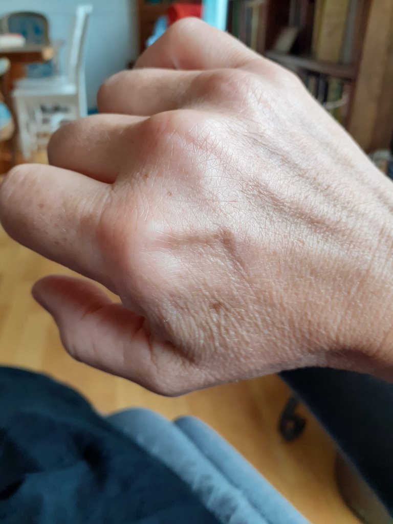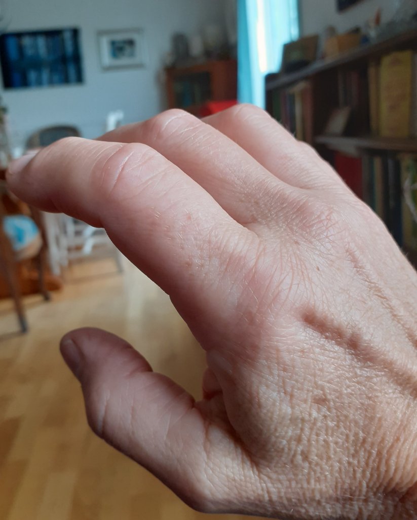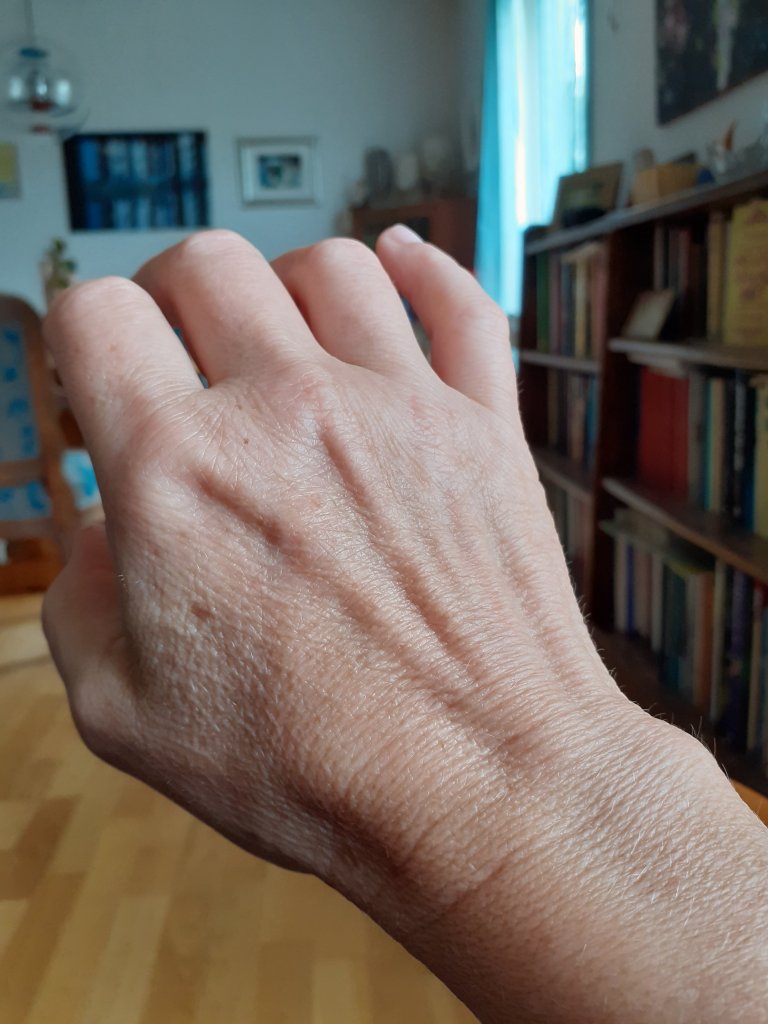 Og reflekterer over hvor avhengig jeg er av hendene, ikke bare denne høyrehånda. Ser at det er mye levd liv i en hånd, sikkert lett om det bare hadde vært hender på et foto å anslå folks alder. Huden har blitt eldre, innsiden også. Ser tydelig at jeg ikke er 38😄.