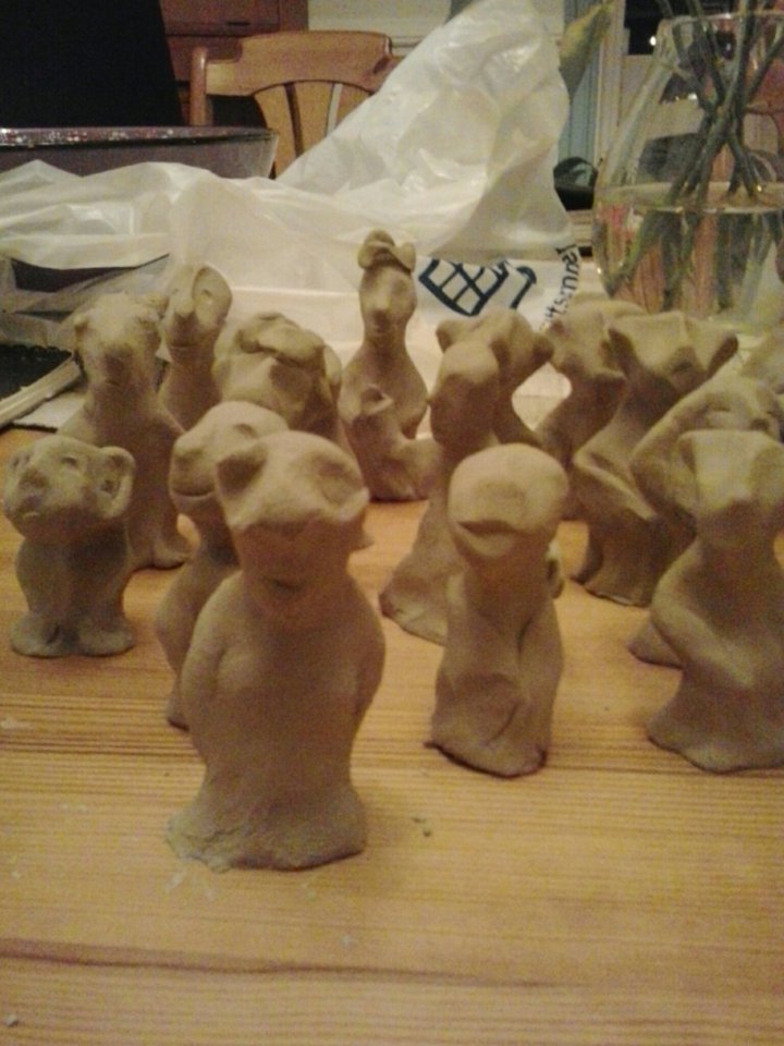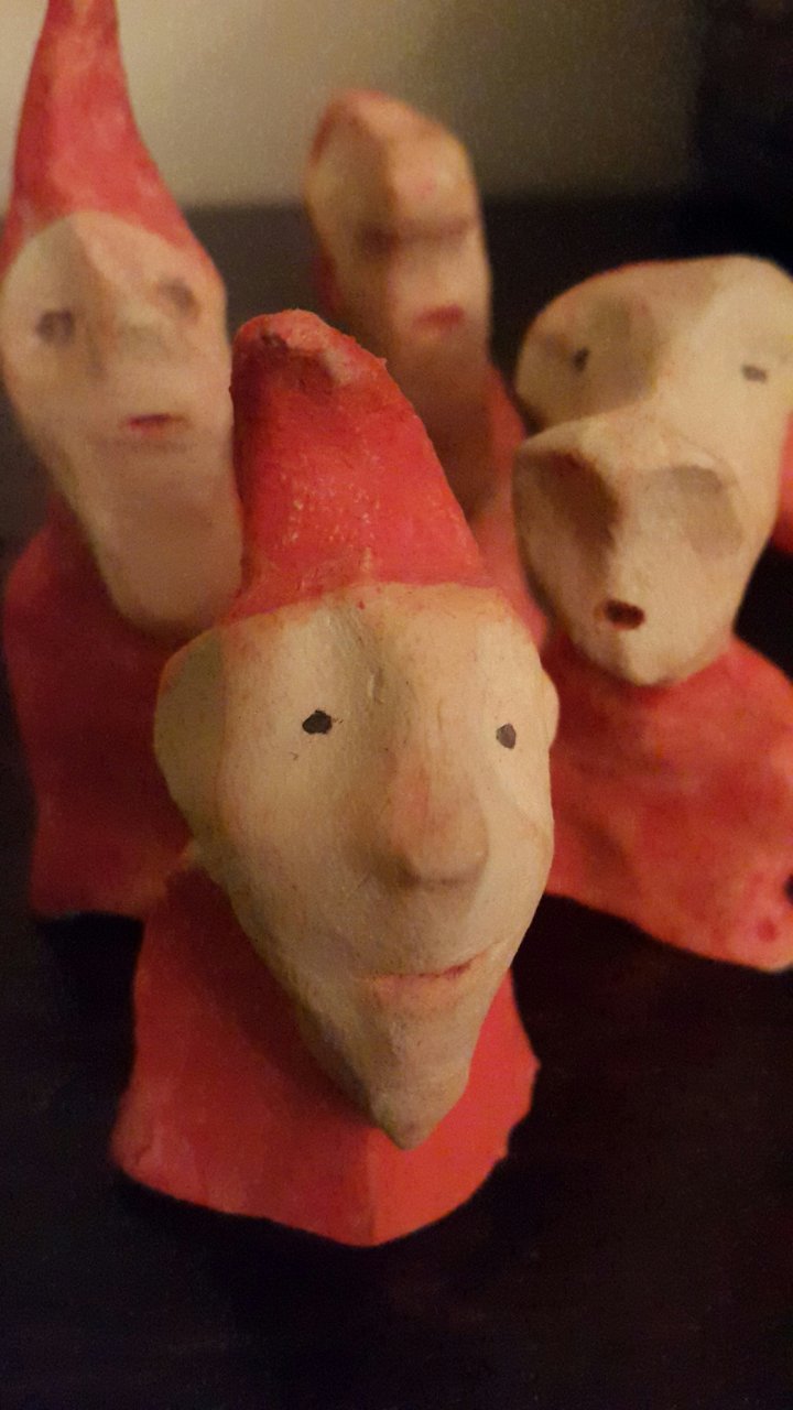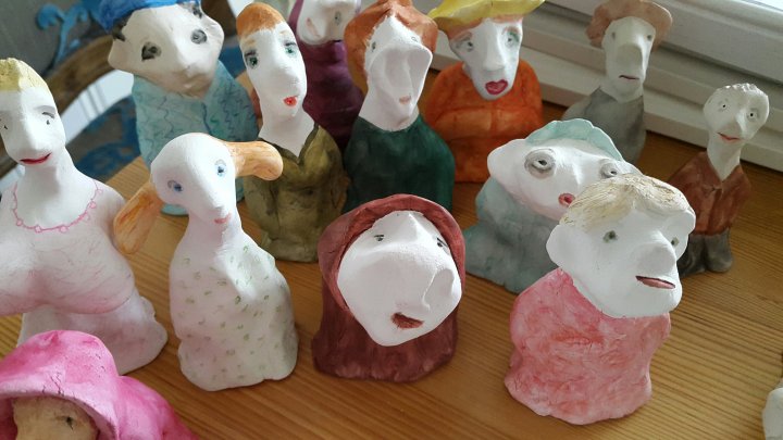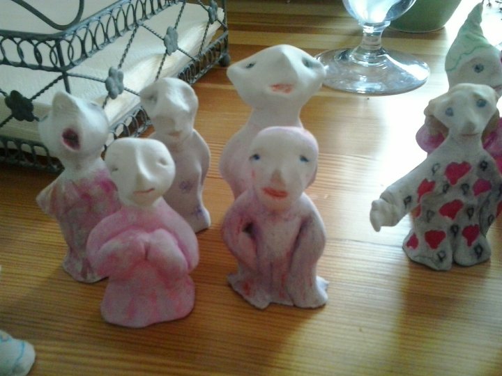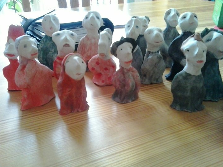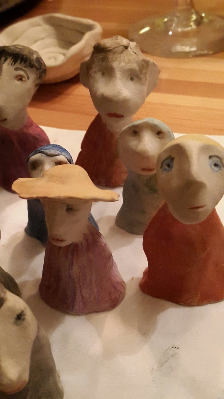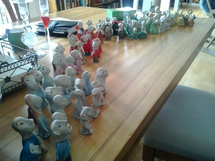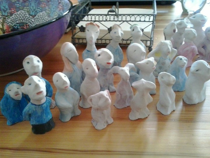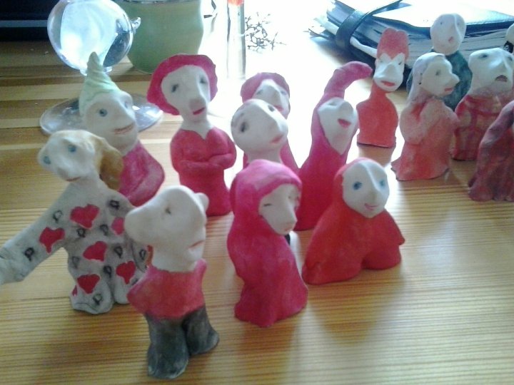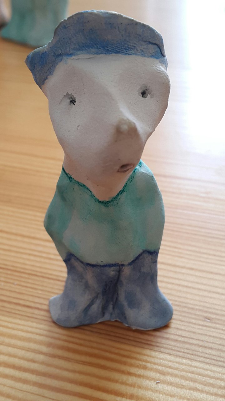 Jeg var i Berlin for noen år siden, og gikk på Kate Kollwitz museet. Der så jeg mange flotte statuer, hun var utrolig god til å uttrykke seg tredimensjonalt. Det var inspirerende. Ideen til å lage millioner av ulike leirefigurer var tent. Jeg sammenlikner meg ikke med henne, men lot meg inspirere! Det må være lov…Konseptet mitt er å skape typer som har noe å si deg som tilskuer. Om det bare er en som taler til deg er målet nådd. Lykken er å få fram følelser i observatøren. Er det noen som passer for deg?God fornøyelse.Figurene selges i butikken til skomakerne i Gamlebyen, i Gamle Fredrikstad.
