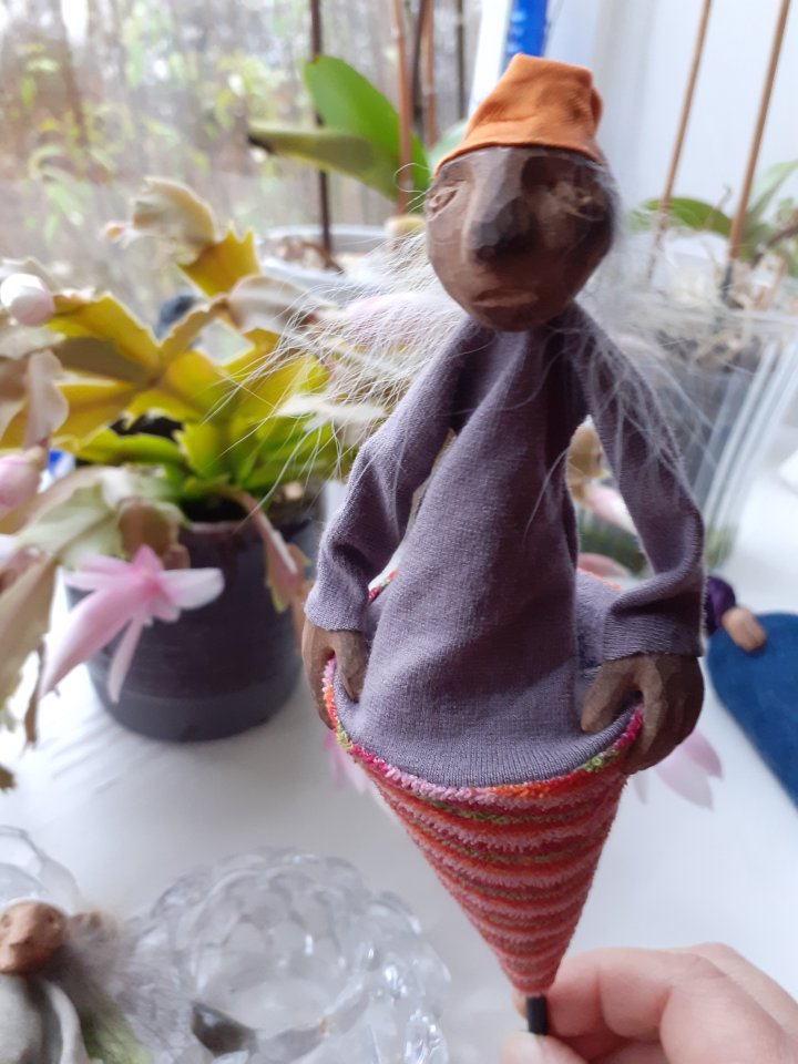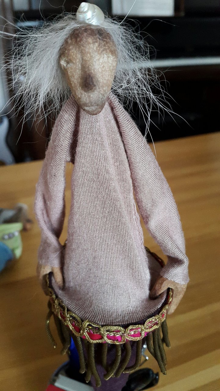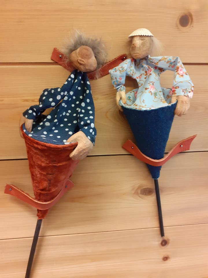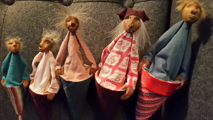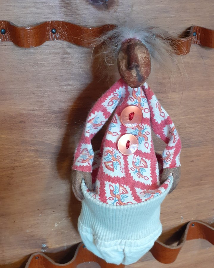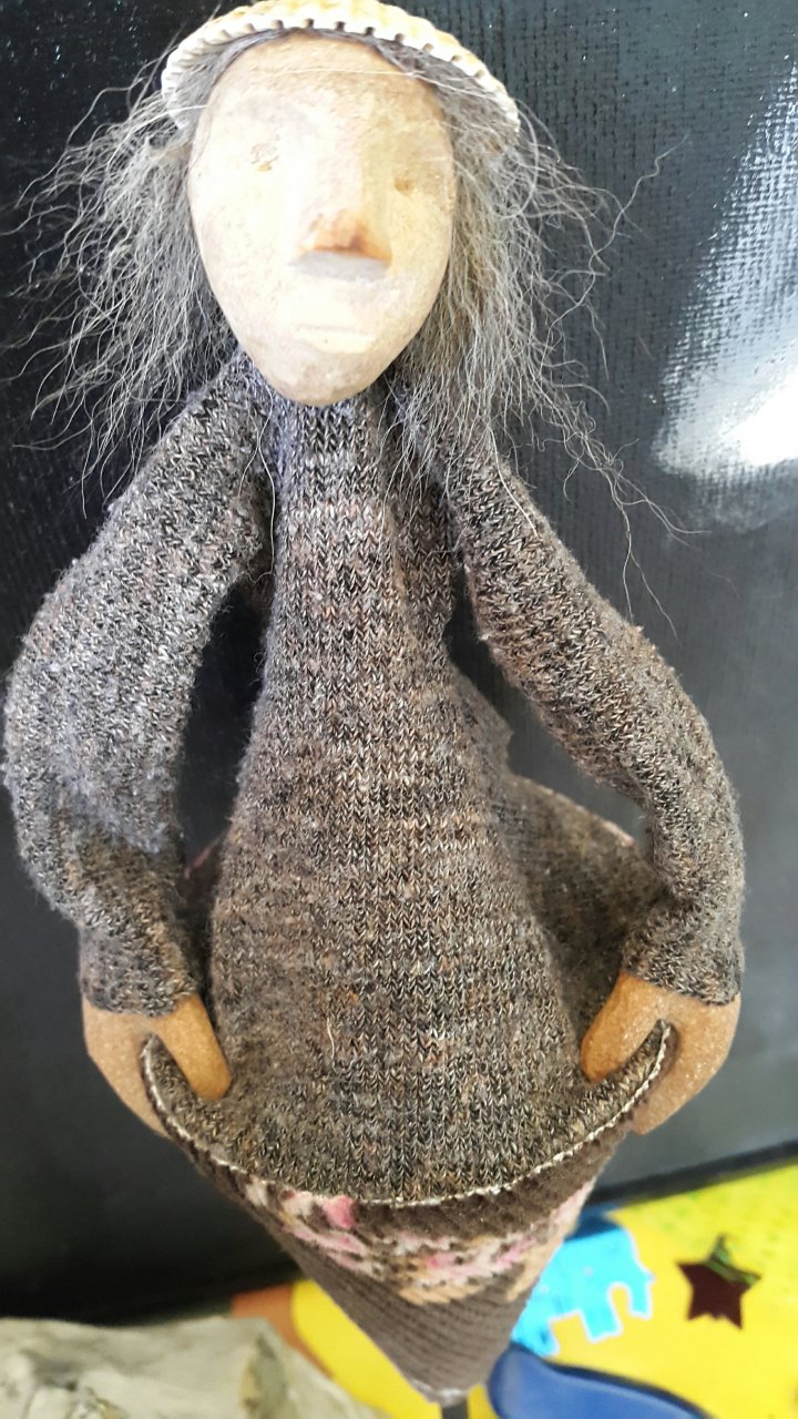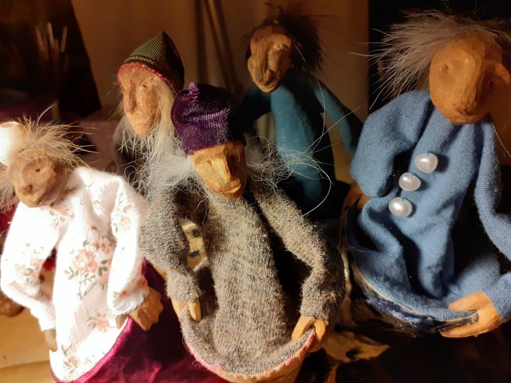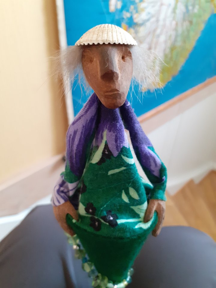HokuspokusdukkerI mange år nå har jeg holdt på å lage disse små dukkene. Det er med mye glede og tålmodighet de ser dagens lys. Jeg spikker ansikter og hender i tørket avokadosten, fordi jeg liker fargetonene og hardheten i dette materialet. Nå for tiden er det også ekstra stas å bringe fram gjenbruksaspektet ved det, har alltid frydet meg over å kunne benytte stenene til noe i stedet for å kaste dem. De andre materialene jeg bruker er også mye gjenbruk, tekstiler er stort sett avlagte klær, og kremmerhusene lages av papp fra diverse frokostblandings-bokser / kjekspakker. Håret er kapp fra buntmaker, og også noen ganger hårklipp fra familiemedlemmer. Bruker også skjell og sneglehus, små perler og steiner til pynt.Dukker kan ses og eventelt kjøpes i butikken til skomakerne i Gamlebyen, Gamle Fredrikstad.