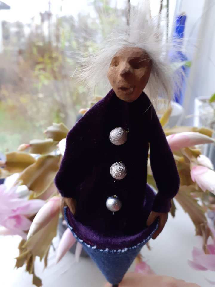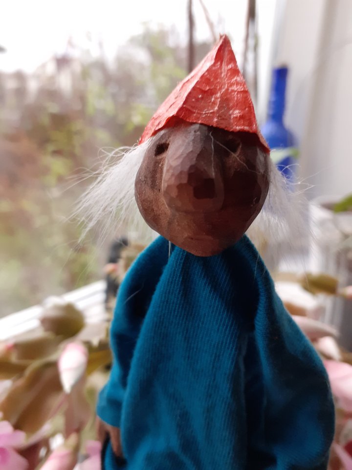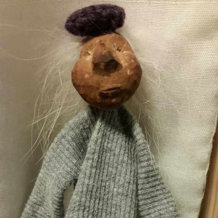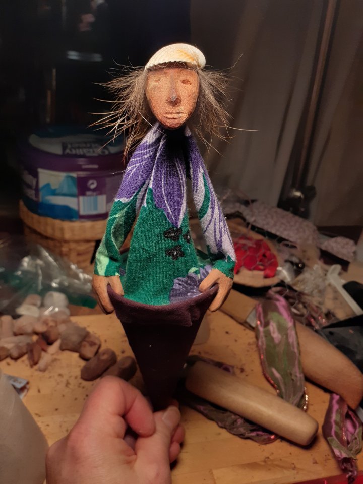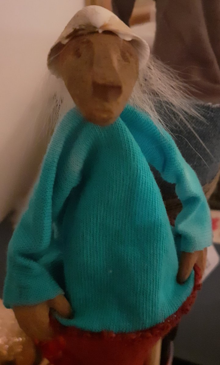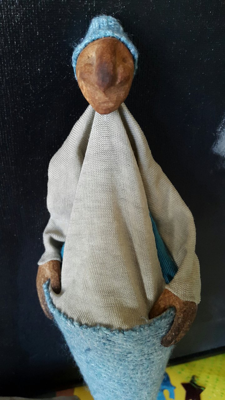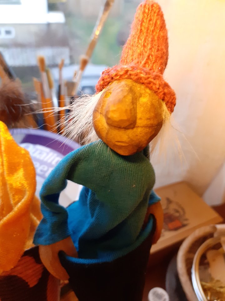HokuspokusdukkerI mange år nå har jeg holdt på å lage disse små dukkene. Det er med mye glede og tålmodighet de ser dagens lys. Jeg spikker ansikter og hender i tørket avokadosten, fordi jeg liker fargetonene og hardheten i dette materialet. Nå for tiden er det også ekstra stas å bringe fram gjenbruksaspektet ved det, har alltid frydet meg over å kunne benytte stenene til noe i stedet for å kaste dem. De andre materialene jeg bruker er også mye gjenbruk, tekstiler er stort sett avlagte klær, og kremmerhusene lages av papp fra diverse frokostblandings-bokser / kjekspakker. Håret er kapp fra buntmaker, og også noen ganger hårklipp fra familiemedlemmer. Bruker også skjell og sneglehus, små perler og steiner til pynt.Dukker kan ses og eventelt kjøpes i butikken til skomakerne i Gamlebyen, Gamle Fredrikstad.