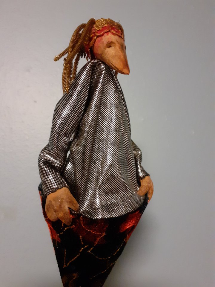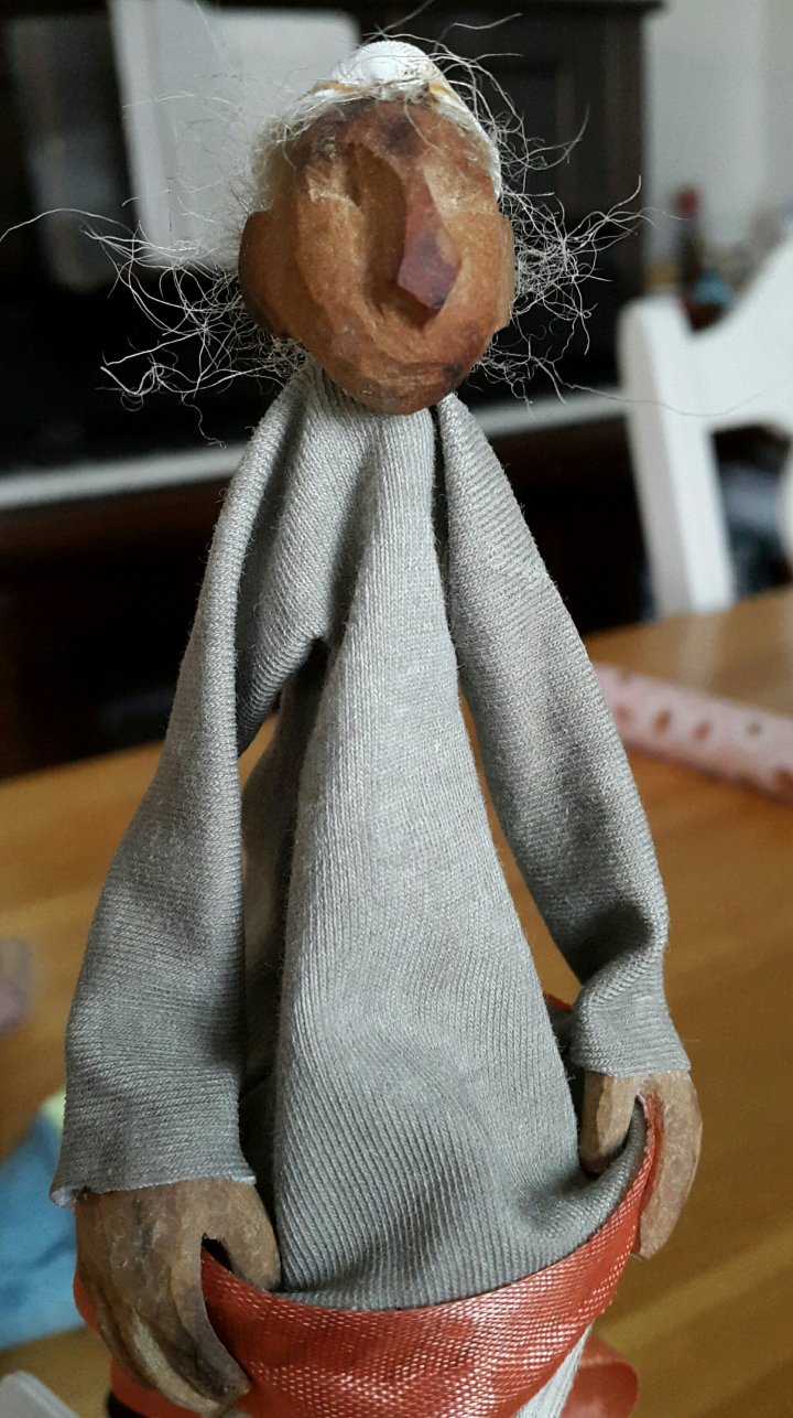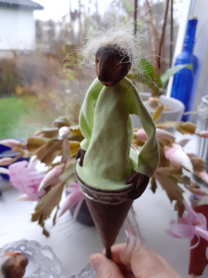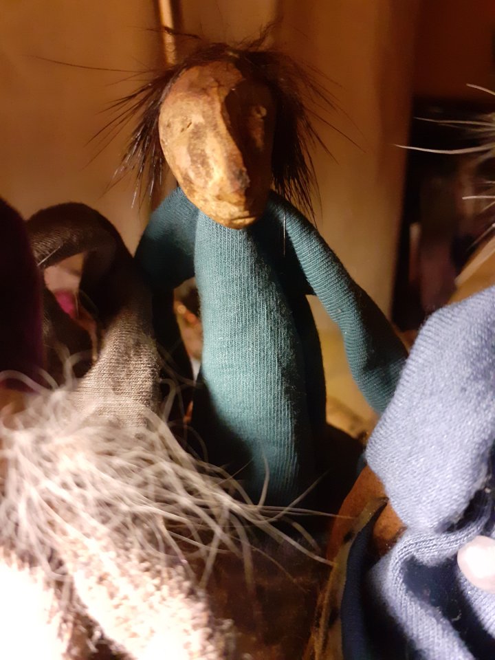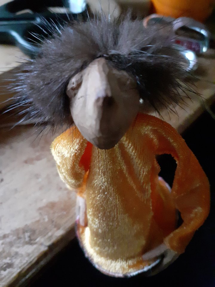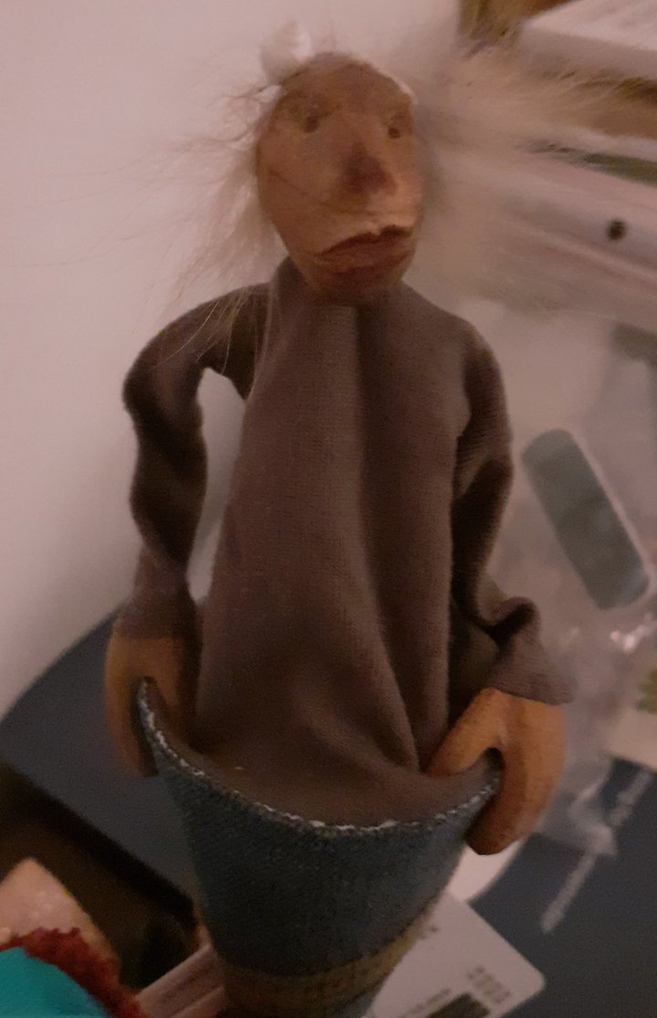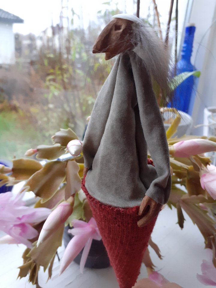 HokuspokusdukkerI mange år nå har jeg holdt på å lage disse små dukkene. Det er med mye glede og tålmodighet de ser dagens lys. Jeg spikker ansikter og hender i tørket avokadosten, fordi jeg liker fargetonene og hardheten i dette materialet. Nå for tiden er det også ekstra stas å bringe fram gjenbruksaspektet ved det, har alltid frydet meg over å kunne benytte stenene til noe i stedet for å kaste dem. De andre materialene jeg bruker er også mye gjenbruk, tekstiler er stort sett avlagte klær, og kremmerhusene lages av papp fra diverse frokostblandings-bokser / kjekspakker. Håret er kapp fra buntmaker, og også noen ganger hårklipp fra familiemedlemmer. Bruker også skjell og sneglehus, små perler og steiner til pynt.Dukker kan ses og eventelt kjøpes i butikken til skomakerne i Gamlebyen, Gamle Fredrikstad.