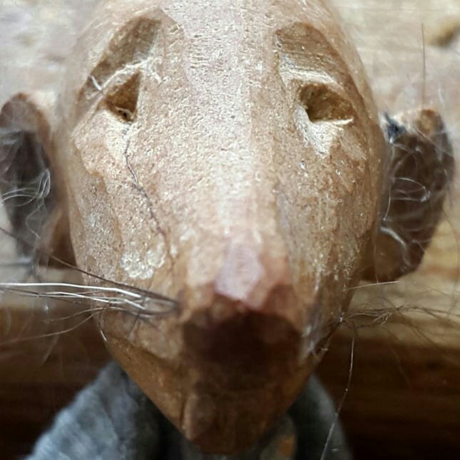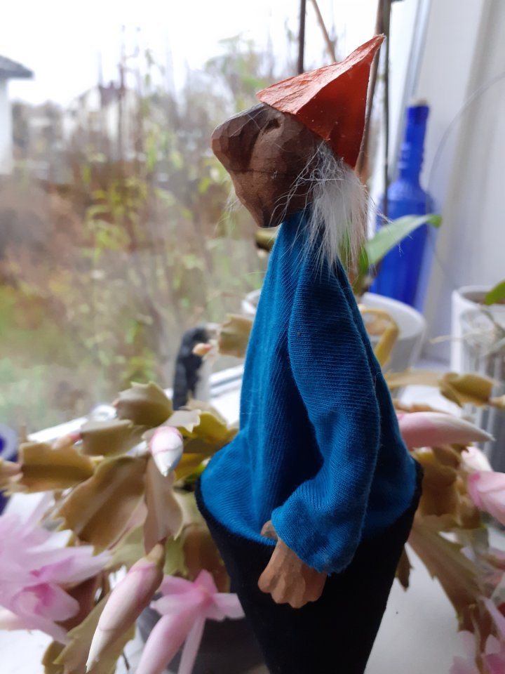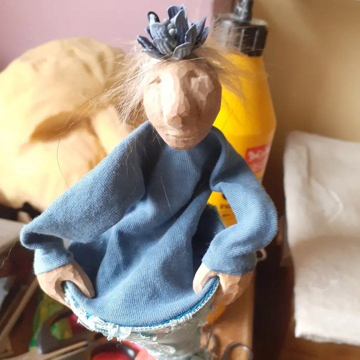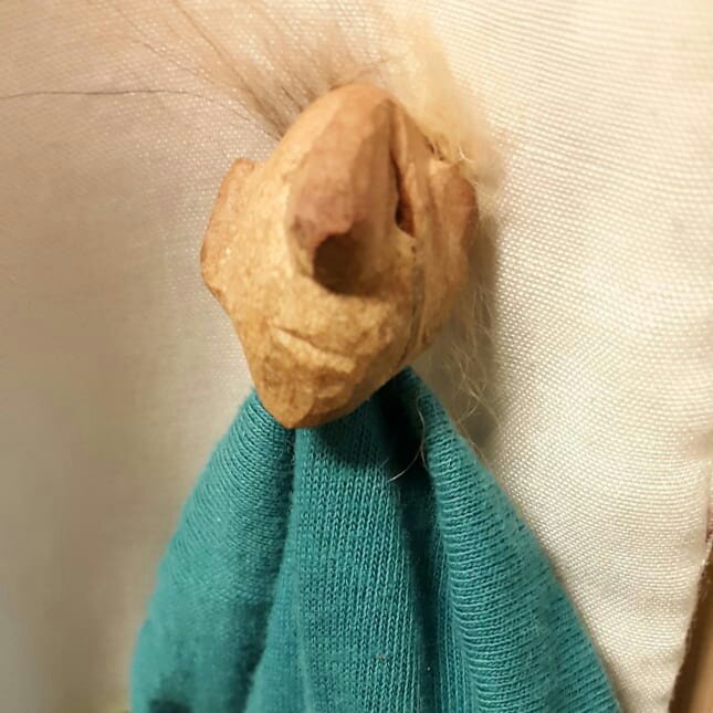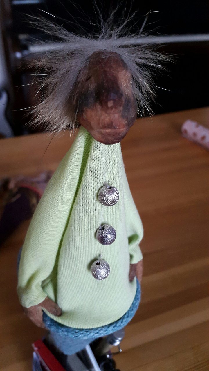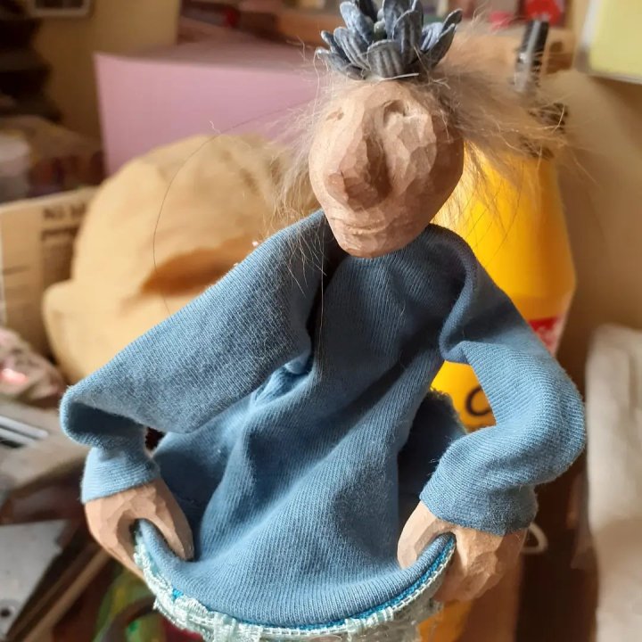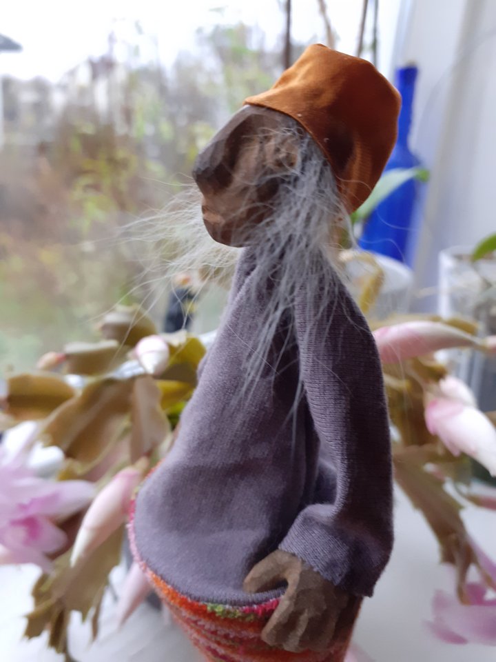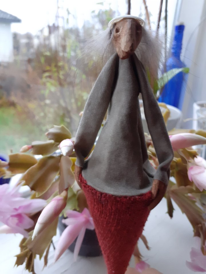 HokuspokusdukkerI mange år nå har jeg holdt på å lage disse små dukkene. Det er med mye glede og tålmodighet de ser dagens lys. Jeg spikker ansikter og hender i tørket avokadosten, fordi jeg liker fargetonene og hardheten i dette materialet. Nå for tiden er det også ekstra stas å bringe fram gjenbruksaspektet ved det, har alltid frydet meg over å kunne benytte stenene til noe i stedet for å kaste dem. De andre materialene jeg bruker er også mye gjenbruk, tekstiler er stort sett avlagte klær, og kremmerhusene lages av papp fra diverse frokostblandings-bokser / kjekspakker. Håret er kapp fra buntmaker, og også noen ganger hårklipp fra familiemedlemmer. Bruker også skjell og sneglehus, små perler og steiner til pynt.Dukker kan ses og eventelt kjøpes i butikken til skomakerne i Gamlebyen, Gamle Fredrikstad.